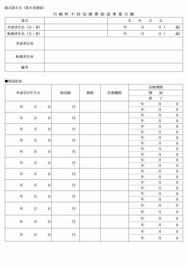 第8条 町長は、助成決定の状況を明確にしておくため、川崎町不妊治療費助成金交付台帳(様式第6号)を備え付け、適正に管理するものとする。