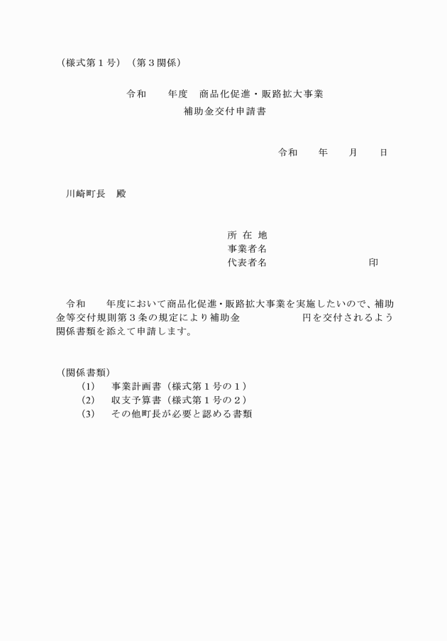 第1 町は、新たな地域商品の開発並びに商品販路拡大の事業に要する経費について、予算の範囲内において当該事業者に対し補助金を交付するものとし、その交付等に関しては補助金等交付規則(昭和56年川崎町規則第10号以下「規則」という。)に定めるところによる。